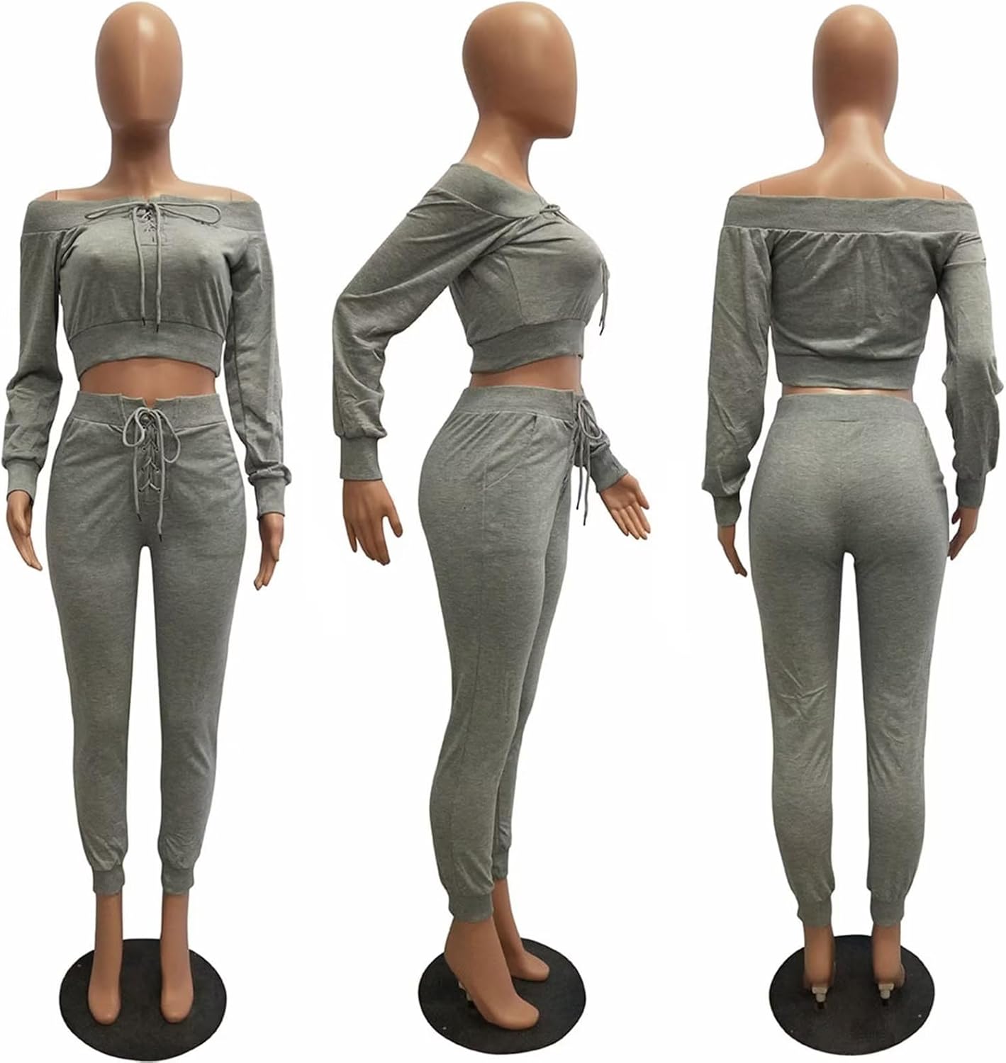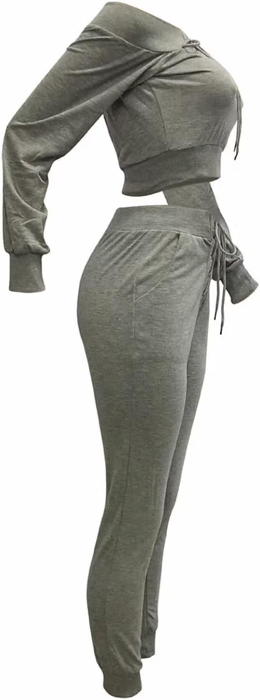 Womens Sexy Lace Up Casual Off Shoulder Long Sleeve Crop Tops & Sweatpants Jogger Pants Two Sweatsuit Set