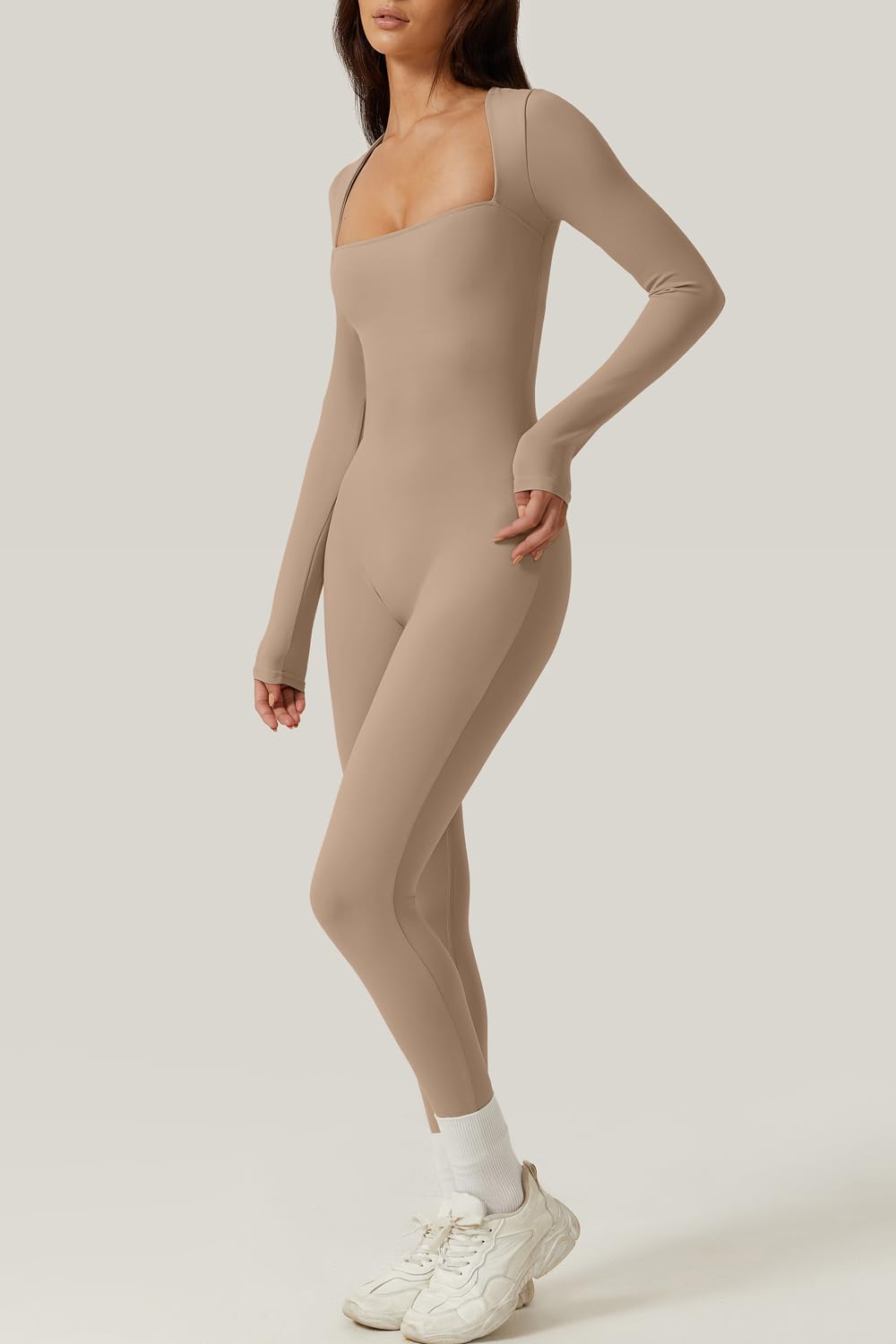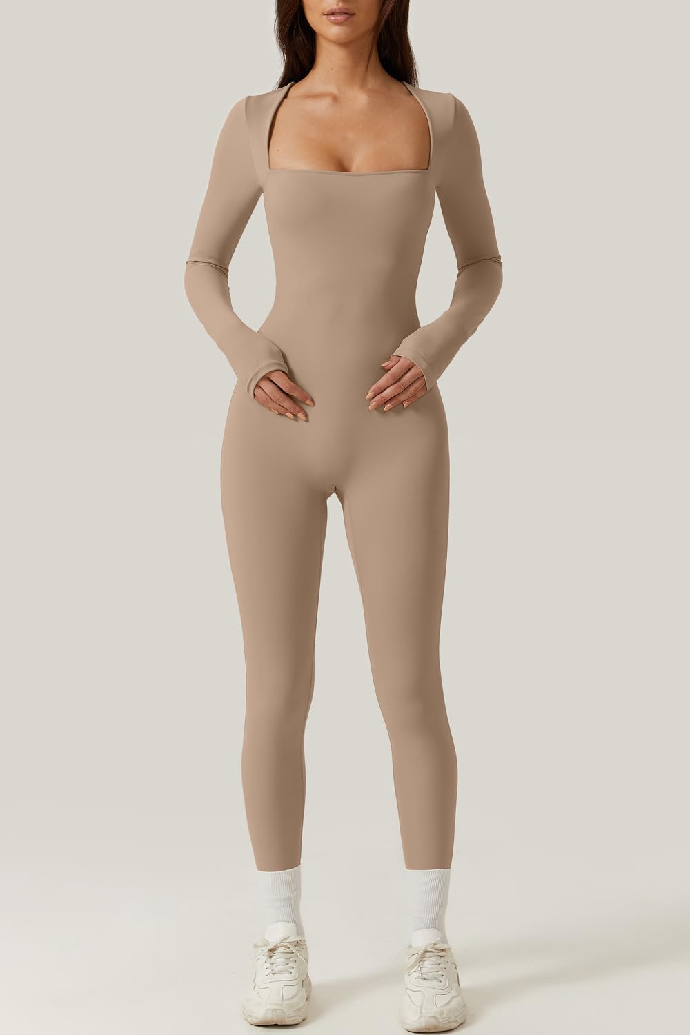 Sexy Square Neck Long Sleeve Bodycon Stretch Jumpsuit for Fall Winter